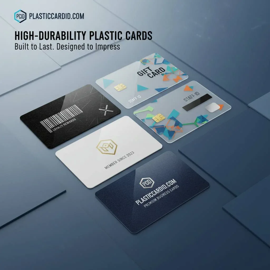 Experience fast turnaround custom ID card printing with us. Custom plastic cards, gift cards, business cards to loyalty cards. Our gallery also includes membership cards, hotel key cards, proximity cards, contactless cards, smart cards, clear plastic cards, casino cards, and plastic postcard mailers. Our PVC and Teslin plastic options cater for durability. Our magnetic stripe cards support easy data storage and access.